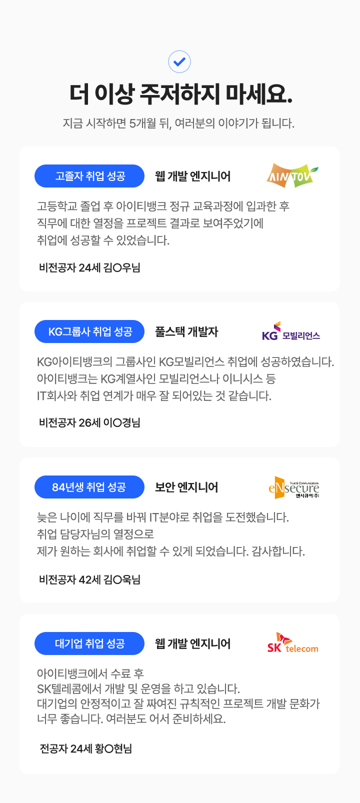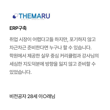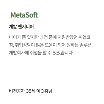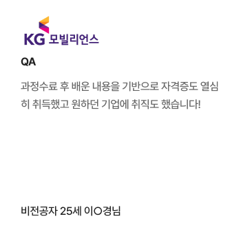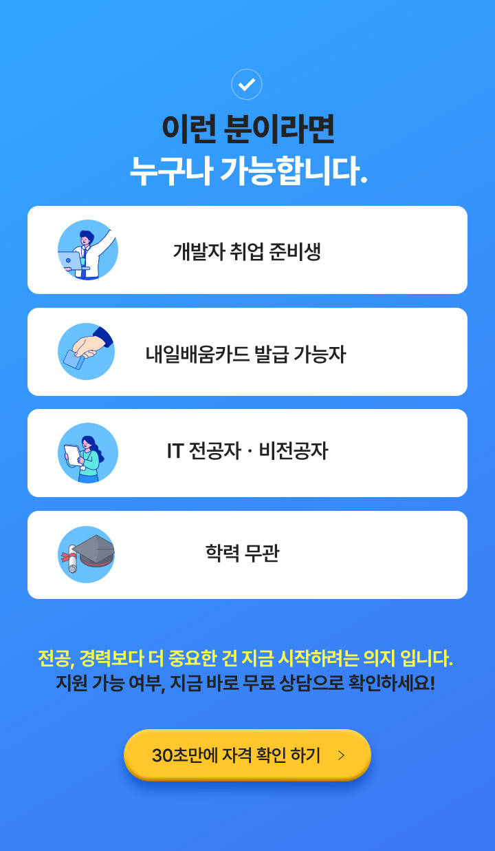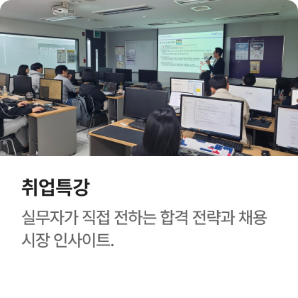 과정중에는 취업지원상담, 취업특강이 진행되며, 과정 수료 후에는 6개월간 사후취업관리를 받으실 수 있습니다.
